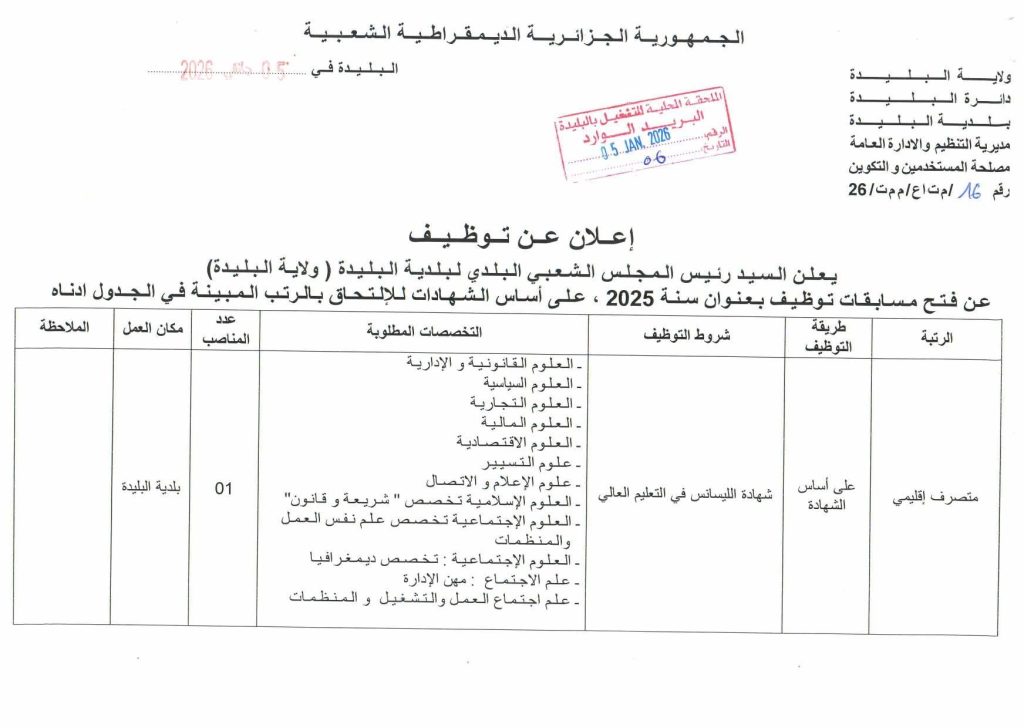 يعلن السيد رئيس المجلس الشعبي البلدي لبلدية البليدة (ولاية البليدة) عن فتح مسابقات توظيف بعنوان سنة 2025، على أساس الشهادات للالتحاق بالرتب المبينة في الجدول أدناه: