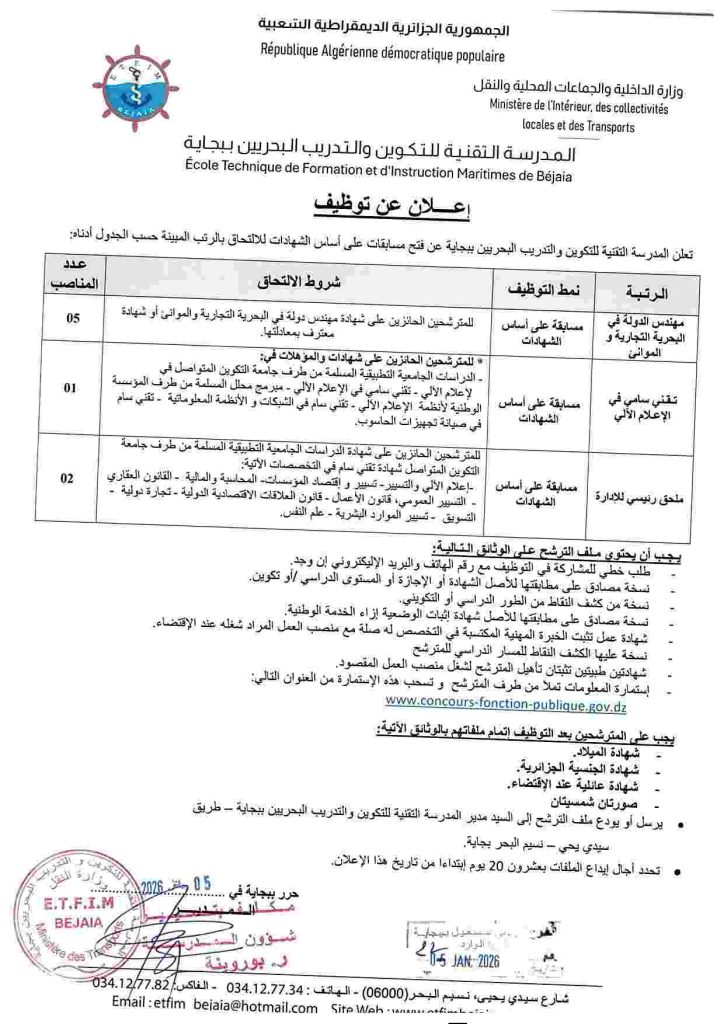تودع ملفات الترشح على مستوى المدرسة التقنية للتكوين والتدريب البحريين ببجاية في أجل عشرون (20) يوماً إبتداءاً من تاريخ أول صدور هذا الإعلان.