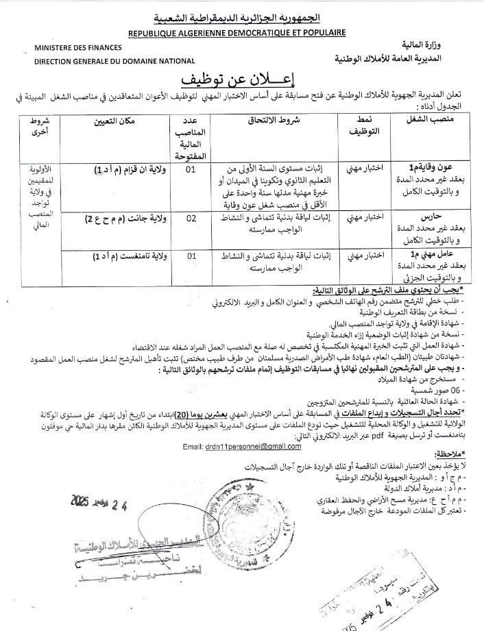 على أساس الاختبار المهني بعشرين يومًا (20) ابتداء من تاريخ أول إشهار على مستوى الوكالة الولائية للتشغيل و الوكالة المحلية للتشغيل حيث تودع الملفات على مستوى المديرية الجهوية للأملاك الوطنية (مكان مقرها بدار المالية) مرفوقون بإستمارة أو ترسل بصيغة pdf عبر البريد الإلكتروني التالي: