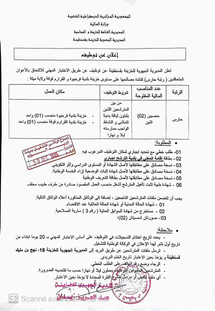 تعلن المديرية الجهوية للخزينة بقسنطينة عن توظيف عن طريق الاختبار المهني للالتحاق بالأعوان المتعاقدين (رتبة حارس) لفائدة مصالحها على مستوى خزينة بلدية فرجيوة والقرارم قوقة ولاية ميلة:
