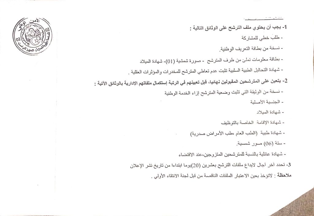 تعلن المديرية العامة للأمن الوطني – مديرية الإدارة العامة – المصلحة الجهوية للمالية والتجهيز تمنراست، عن فتح عملية التوظيف بعنوان السنة المالية (2025)، عن طريق الانتقاء بناءً على دراسة ملف للالتحاق بسلك الأعوان المتعاقدين، لفائدة مصالحها حسب الجدول أدناه: