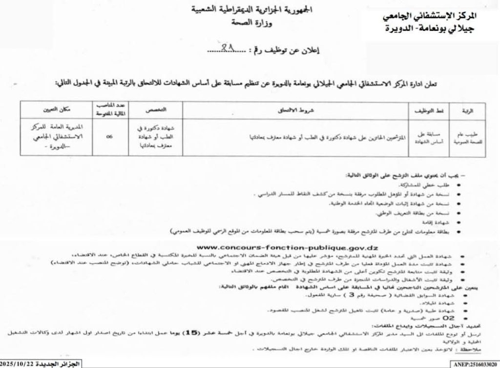 تعلن إدارة المركز الاستشفائي الجامعي الجيلالي بونعامة بالدويرة عن تنظيم مسابقة على أساس الشهادات للالتحاق بالرتبة المبينة في الجدول التالي: