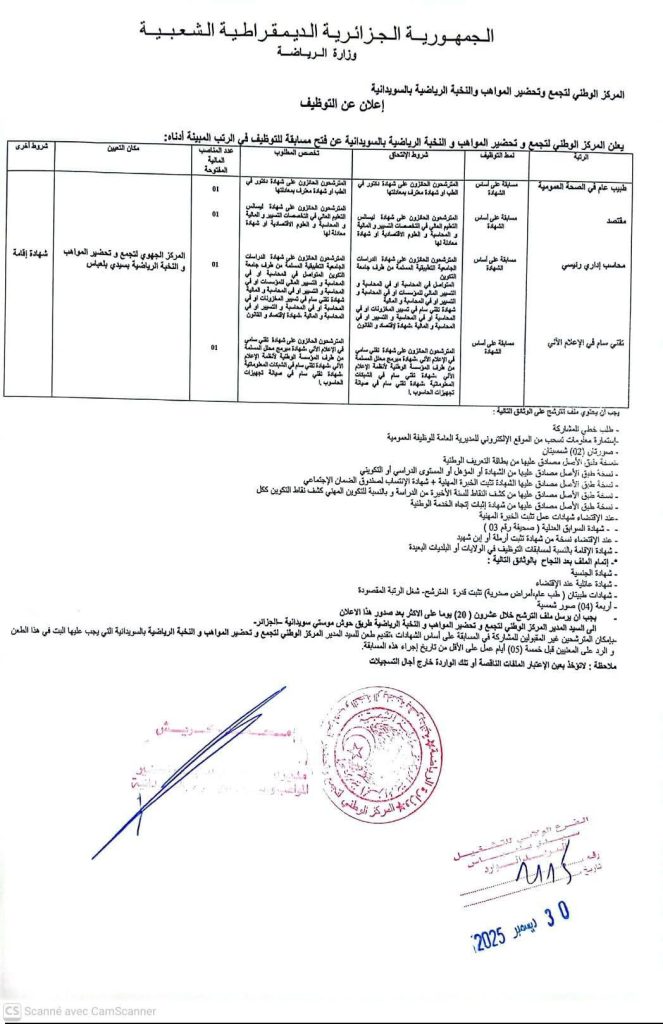 إعلان عن توظيف بالمركز الوطني لتجمع وتحضير المواهب والنخبة الرياضية