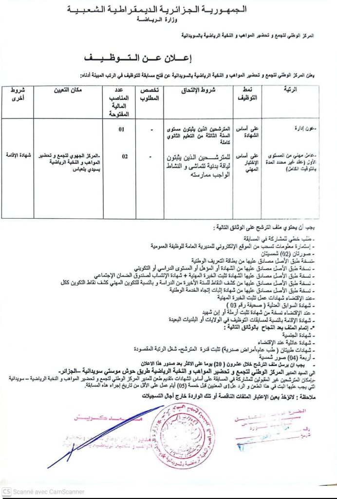 يجب أن يرسل ملف الترشح خلال عشرون (20) يوما على الأكثر بعد صدور هذا الإعلان إلى السيد المدير المركز الوطني لتجمع وتحضير المواهب والنخبة الرياضية طريق حوش موستي سويدانية -الجزائر-