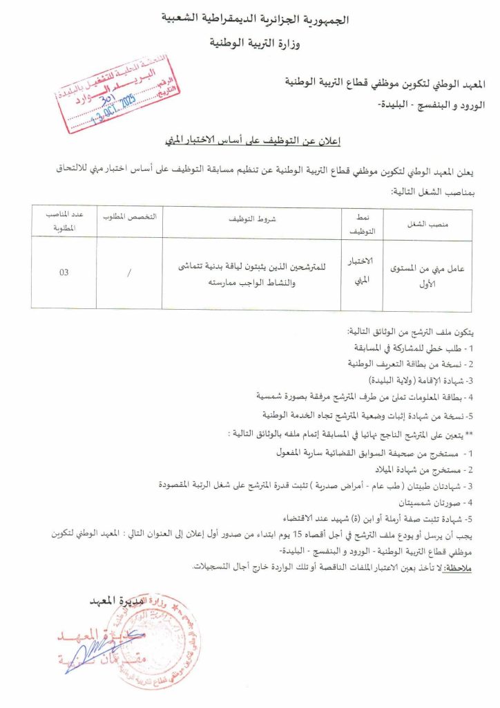 يجب أن يرسل أو يودع ملف الترشح في أجل أقصاه 15 يوم إبتداء من صدور أول إعلان إلى العنوان التالي: المعهد الوطني لتكوين موظفي قطاع التربية الوطنية – الورود و البنفسج – البليدة.