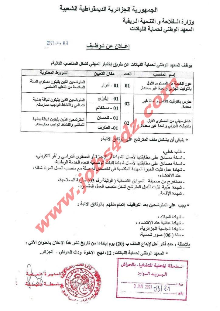 إعلان عن توظيف على أساس الإختبار المهني بالمعهد الوطني لحماية النباتات الكائن مقره بالحراش بالجزائر العاصمة