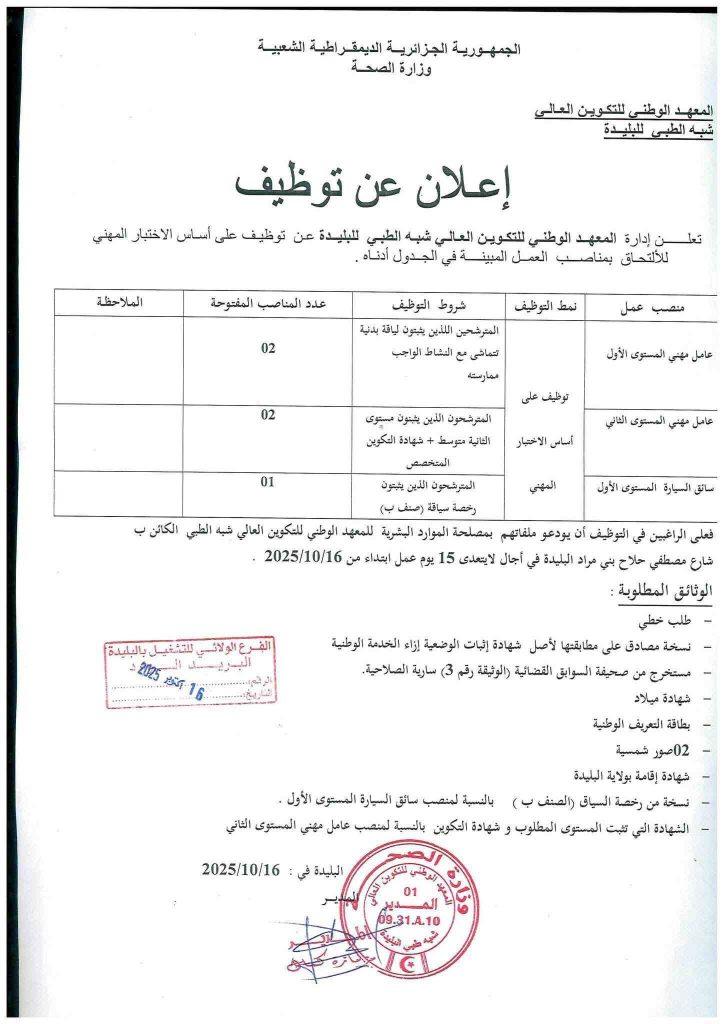 تعلن إدارة المعهد الوطني للتكوين العالي شبه الطبي للبليدة عن توظيف على أساس الاختبار المهني للالتحاق بمناصب الشغل المبينة في الجدول أدناه.