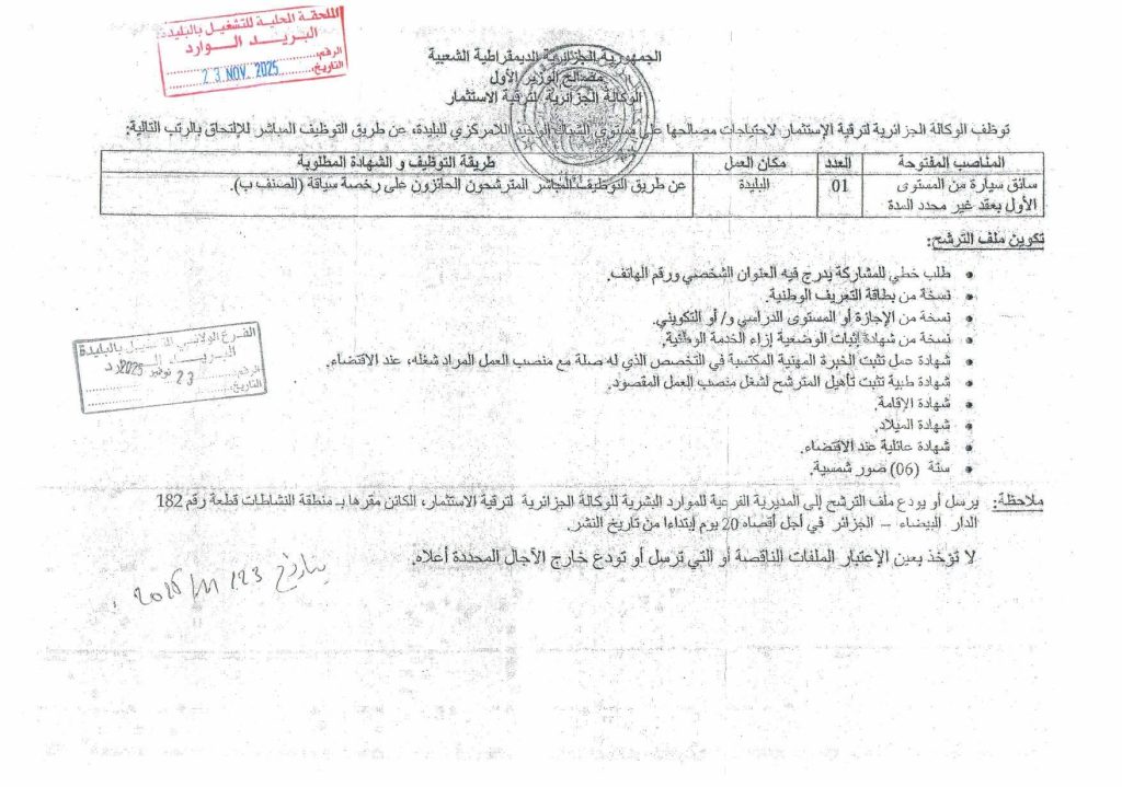 ملاحظة: يُرسل أو يودع ملف الترشح في المديرية الفرعية للموارد البشرية للوكالة الجزائرية لترقية الاستثمار، الكائن مقرها بـ منطقة النشاطات قطعة رقم 182 الدار البيضاء – الجزائر – في أجل أقصاه 20 يوم إبتداءاً من تاريخ النشر.