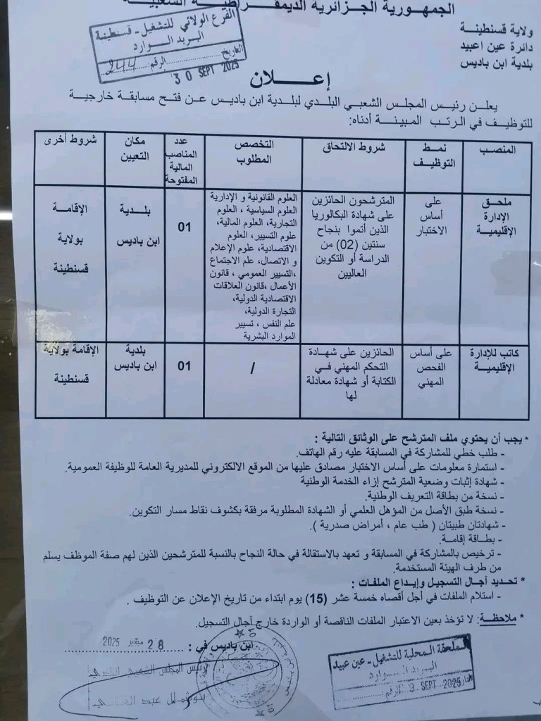 إعلان عن توظيف ببلدية ابن باديس ولاية قسنطينة