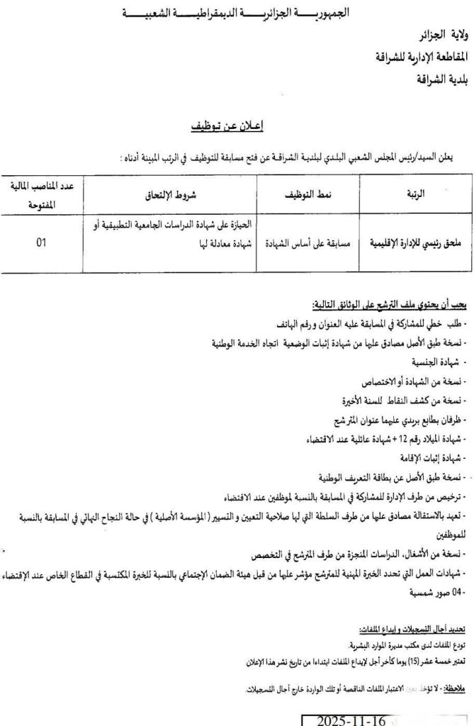 يعلن السيد/رئيس المجلس الشعبي البلدي لبلدية الشراقة عن فتح مسابقة للتوظيف في الرتب المبينة أدناه: