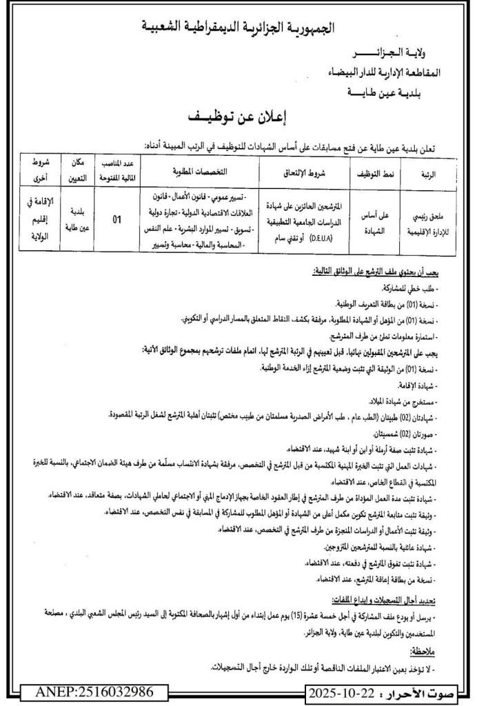 - يرسل أو يودع ملف المشاركة في أجل خمسة عشر (15) يوم عمل إبتداء من أول إشهار بالصحافة المكتوبة إلى السيد رئيس المجلس الشعبي البلدي، مصلحة المستخدمين والتكوين لبلدية عين طاية، ولاية الجزائر.