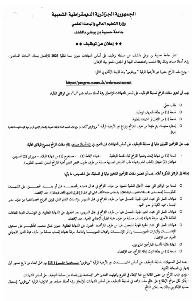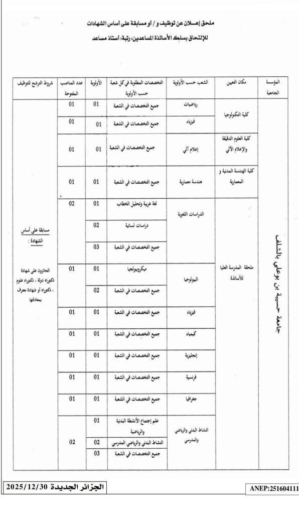 تعلن جامعة حسيبة بن بوعلي بالشلف عن مسابقة توظيف على أساس الشهادات بعنوان سنة المالية 2025 للالتحاق بسلك الأساتذة المساعدين، رتبة: أستاذ مساعد وذلك وفقاً للشعب والتخصصات المبينة في الجدول الملحق بهذا الإعلان.