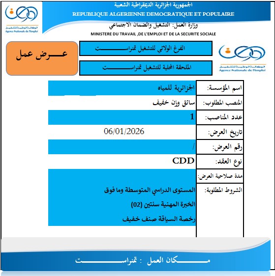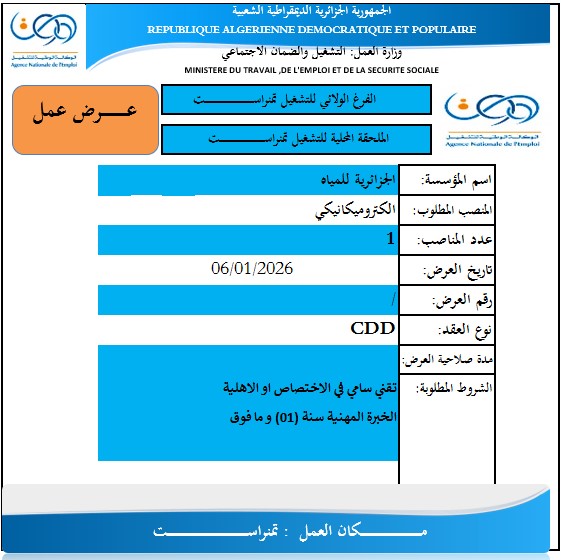 يعلن الفرع الولائي والملحقة المحلية للتشغيل بتمنراست، عن توفر عروض عمل لدى مؤسسة الجزائرية للمياه، بتاريخ 06/01/2026، بعقود عمل محددة المدة (CDD)، وذلك في التخصصات التالية: