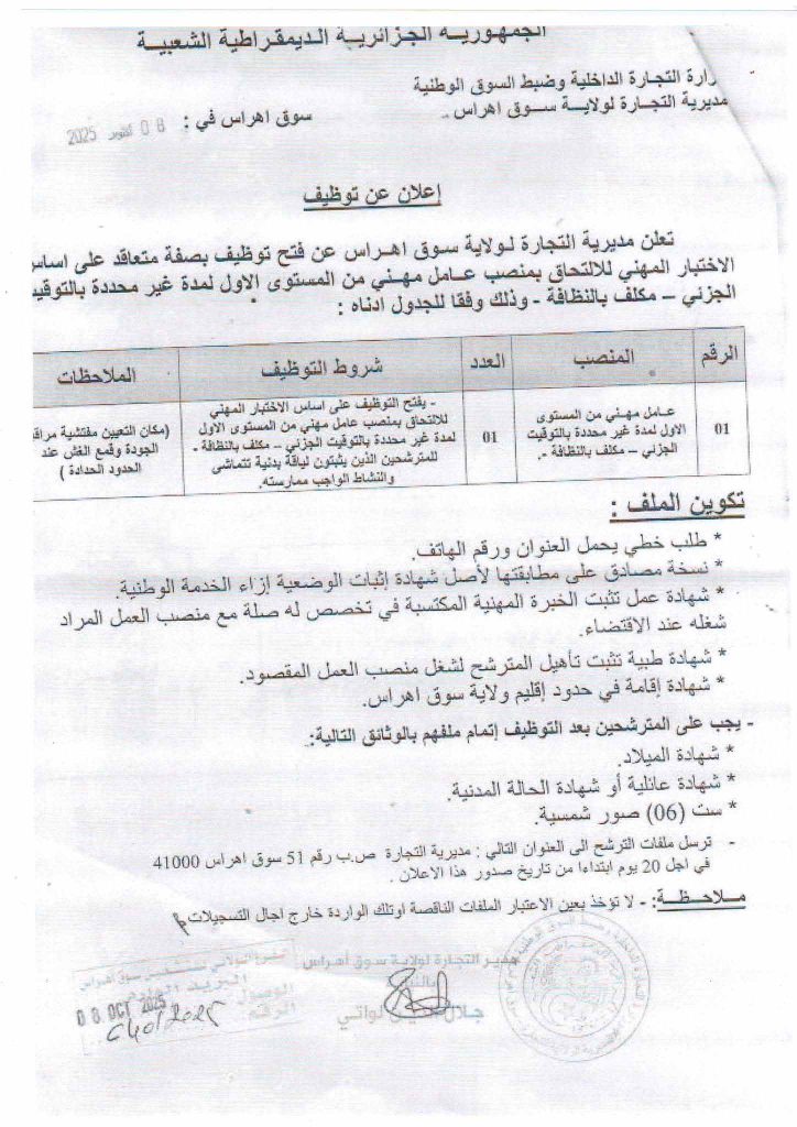 تعلن مديرية التجارة لولاية سوق اهراس عن فتح توظيف بصفة متعاقد على أساس الاختبار المهني للالتحاق بمنصب عامل مهني من المستوى الأول لمدة غير محددة بالتوقيت الجزئي – مكلف بالنظافة – وذلك وفقا للجدول أدناه :