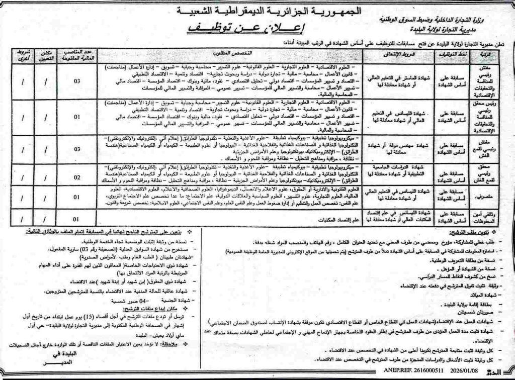 تعلن مديرية التجارة لولاية البليدة عن فتح مسابقات للتوظيف على أساس الشهادة في الرتب المبينة أدناه: