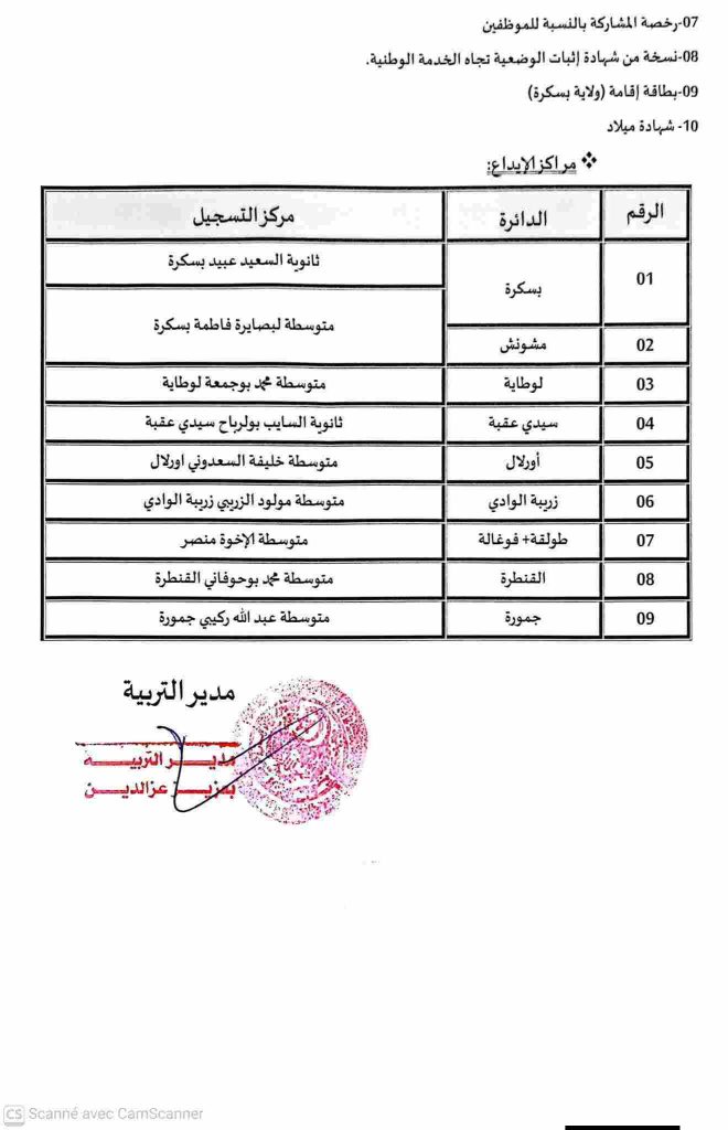 - يُشرع في إيداع الملفات على مستوى المراكز المبينة أدناه يومياً من الساعة الثامنة والنصف (08:30) صباحاً إلى غاية الساعة الواحدة (13:00) زوالاً باستثناء أيام الجمعة والسبت.