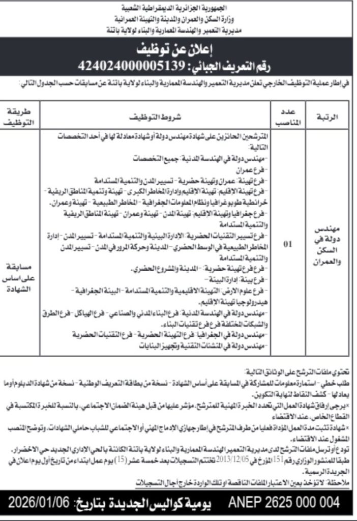في إطار عملية التوظيف الخارجي تعلن مديرية التعمير والهندسة المعمارية والبناء لولاية باتنة عن مسابقات حسب الجدول التالي: