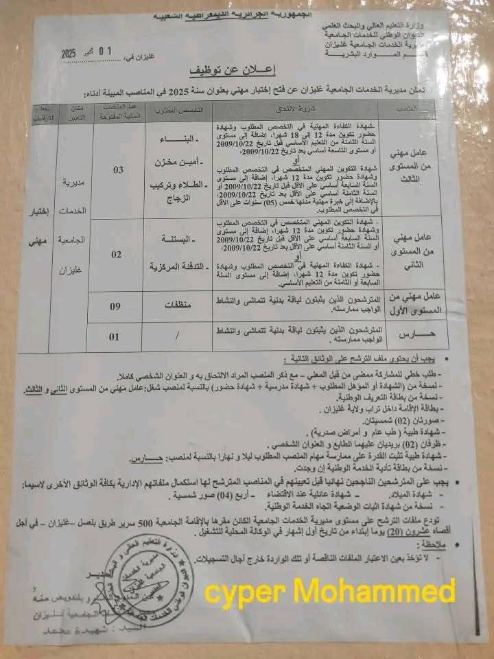 تعلن مديرية الخدمات الجامعية غليزان عن فتح إختبار مهني بعنوان سنة 2025 في المناصب المبينة أدناه: