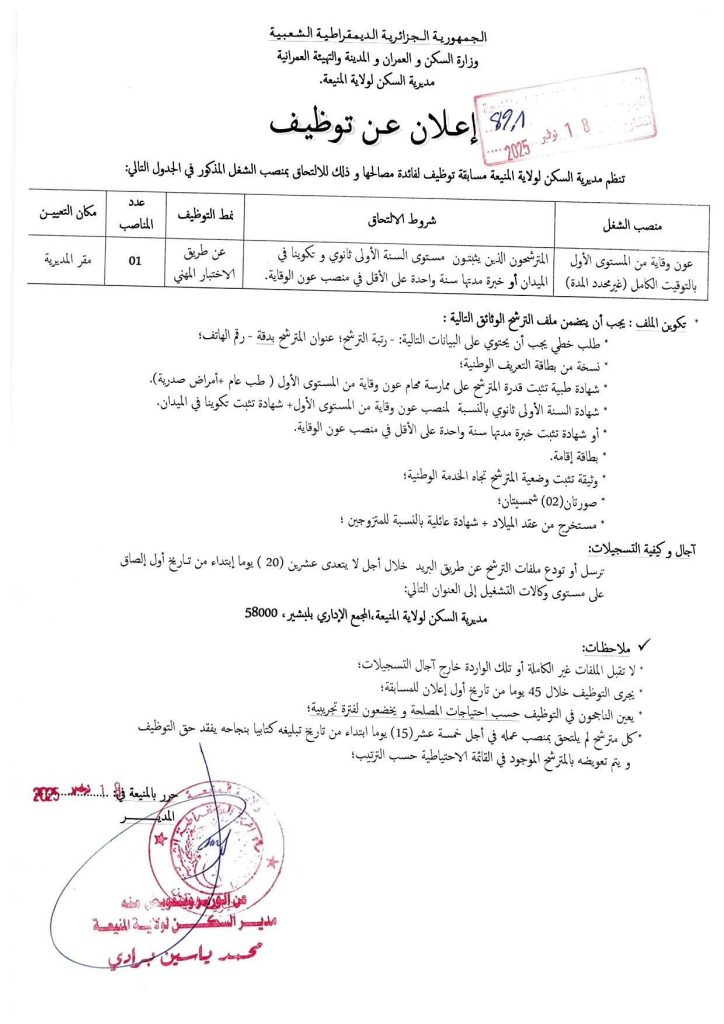 • ترسل أو تودع ملفات الترشح عن طريق البريد خلال أجل لا يتعدى عشرين (20) يومًا إبتداء من تاريخ أول إعلان على مستوى وكالات التشغيل إلى العنوان التالي:مديرية السكن لولاية المنيعة بالحي الإداري بلعشور، 58000