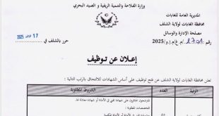 عون وقاية من المستوى الأول بالتوقيت الكامل (غير محدد المدة)01عن طريق الاختيار المهنيالمترشحون الذين يثبتون: مستوى السنة الأولى ثانوي و تكوينا في الميدان أو خبرة مدتها سنة واحدة على الأقل في منصب عون وقاية.مقر المديرية