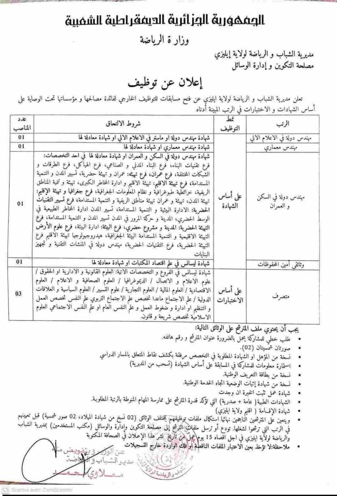 تعلن مديرية الشباب والرياضة لولاية إيليزي عن فتح مسابقات للتوظيف الخارجي لفائدة مصالحها ومؤسساتها تحت الوصاية على أساس الشهادات والاختبارات في الرتب المبينة أدناه: