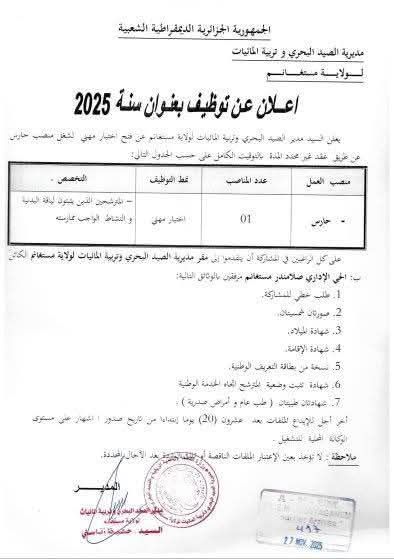 يعلن السيد مدير الصيد البحري وتربية المائيات لولاية مستغانم عن فتح اختيار مهني لمنصب حارس عن طريق عقد غير محدد المدة بالتوظيف الكامل على حسب الجدول التالي: