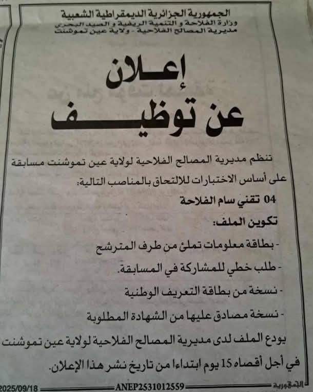 تنظم مديرية المصالح الفلاحية لولاية عين تموشنت مسابقة على أساس الإختبارات للالتحاق بالمناصب التالية: