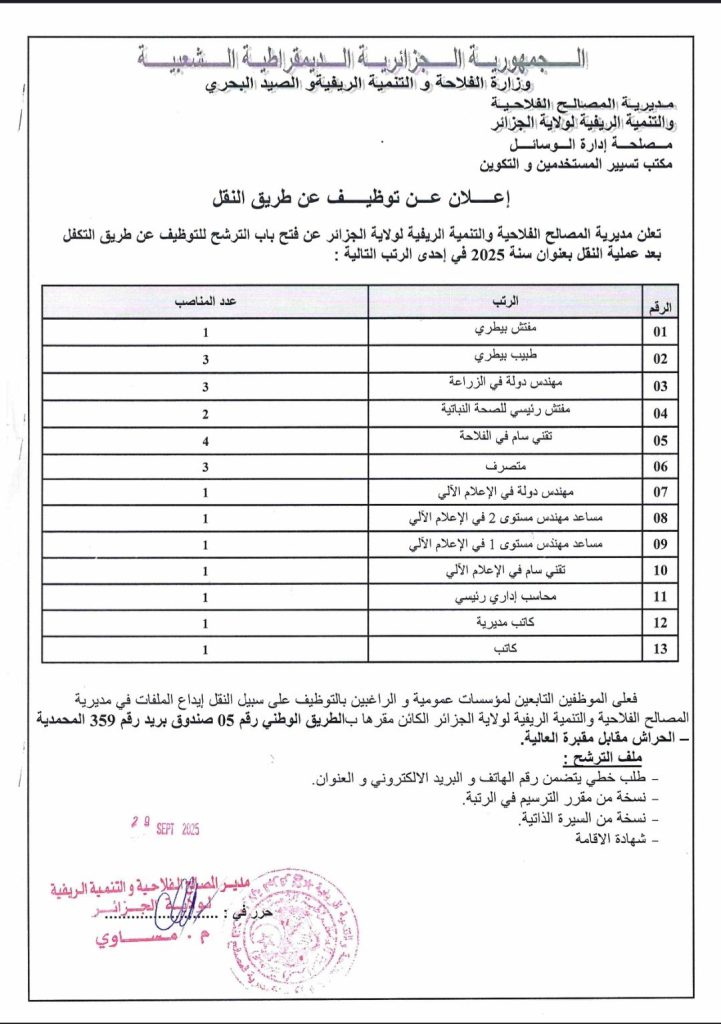 تعلن مديرية المصالح الفلاحية والتنمية الريفية لولاية الجزائر عن فتح باب الترشح للتوظيف عن طريق التكفل بعد عملية النقل بعنوان سنة 2025 في إحدى الرتب التالية :