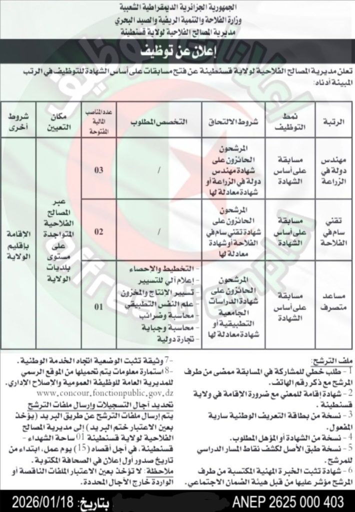 تعلن مديرية المصالح الفلاحية لولاية قسنطينة عن فتح مسابقات على أساس الشهادة للتوظيف في الرتب المبينة أدناه: