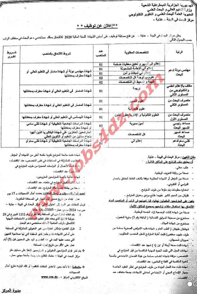 يعلن مركز البحث في البيئة بولاية عنابة عن توظيف على أساس الشهادة في المناصب التالية