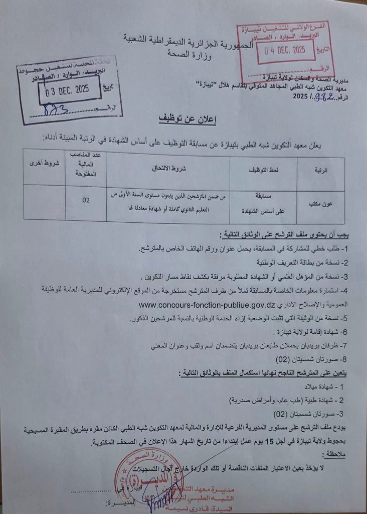 يعلن معهد التكوين شبه الطبي بتيبازة عن مسابقة توظيف على أساس الشهادة في الرتبة المبينة أدناه: