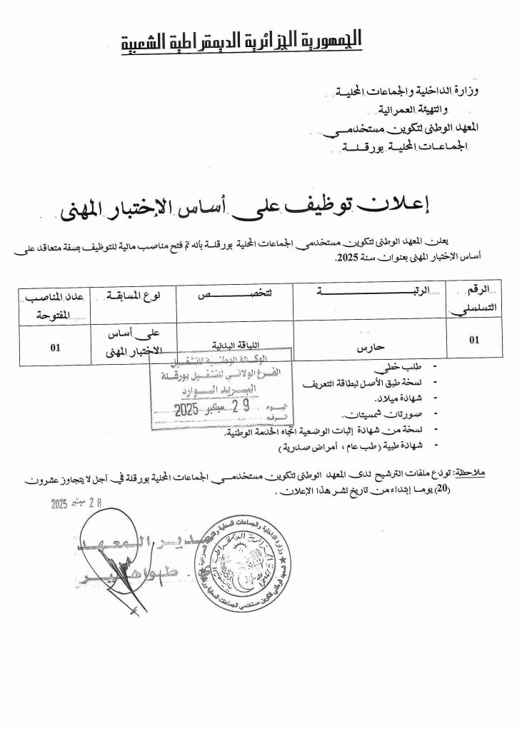 يعلن المعهد الوطني لتكوين مستخدمي الجماعات المحلية بورقلة بأنه تم فتح مناصب مالية للتوظيف بصفة متعاقد على أساس الإختبار المهني بعنوان سنة 2025.