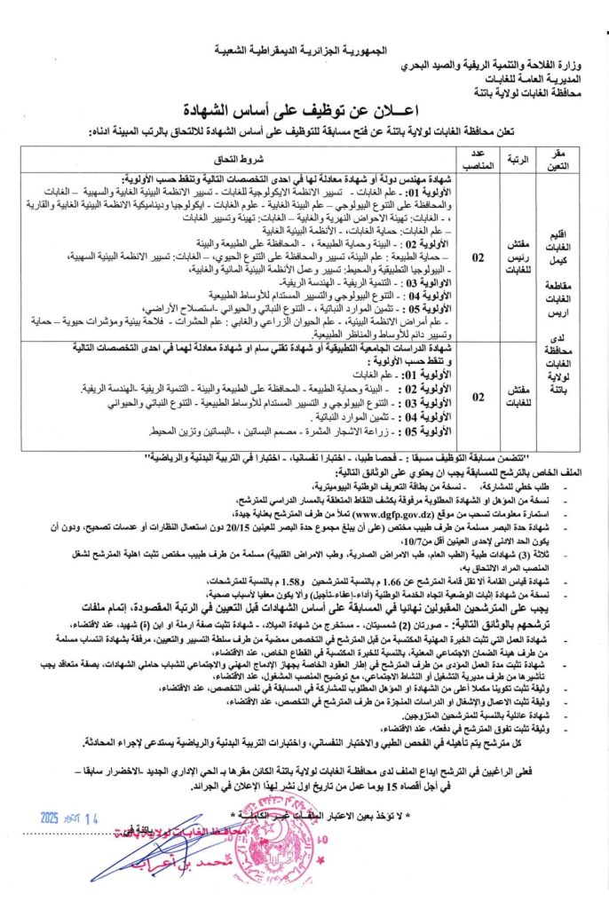 تعلن محافظة الغابات لولاية باتنة عن فتح مسابقة للتوظيف على أساس الشهادة للالتحاق بالرتب المبينة أدناه: