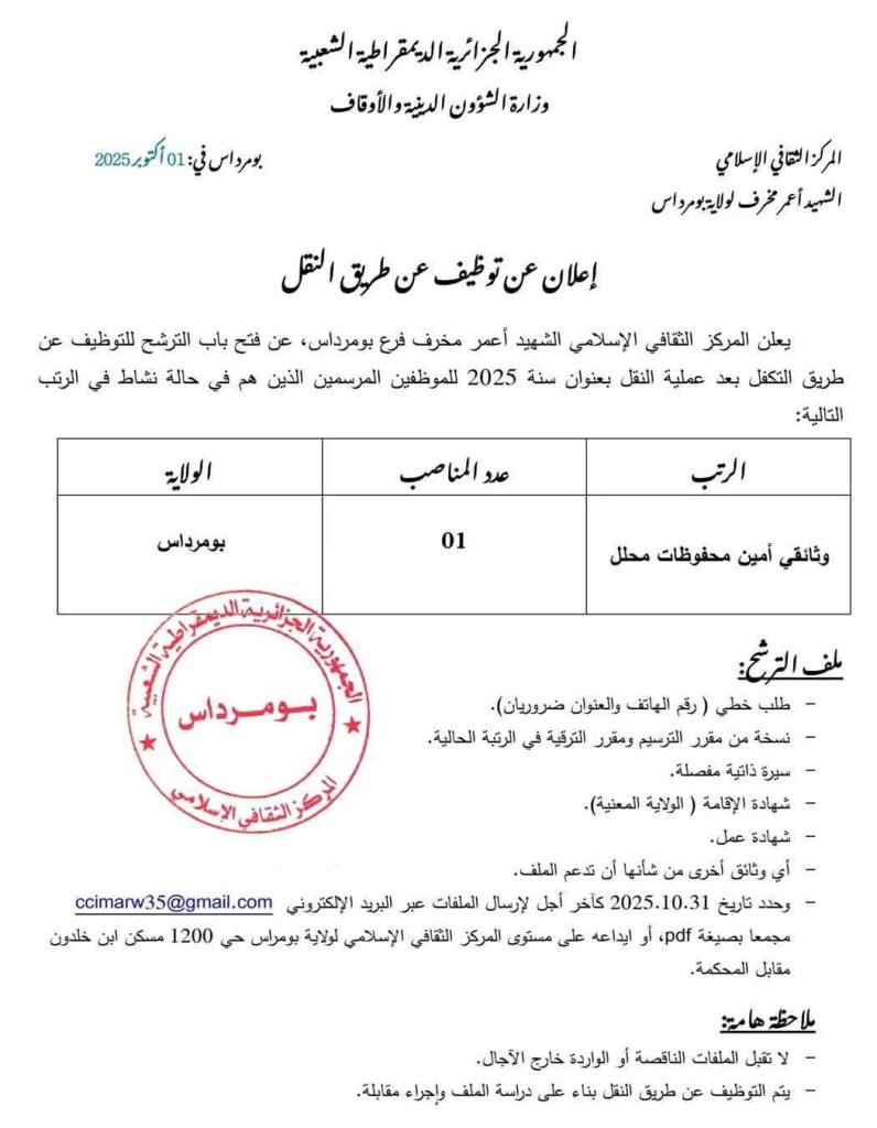 يعلن المركز الثقافي الإسلامي الشهيد أعمر مخرف فرع بومرداس، عن فتح باب الترشح للتوظيف عن طريق التكفل بعد عملية النقل بعنوان سنة 2025 للموظفين المرسمين الذين هم في حالة نشاط في الرتب التالية: