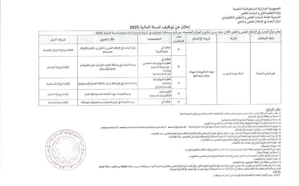 - إعلان عن توظيف للسنة المالية 2025 بمركز البحث في الإعلام العلمي و التقني