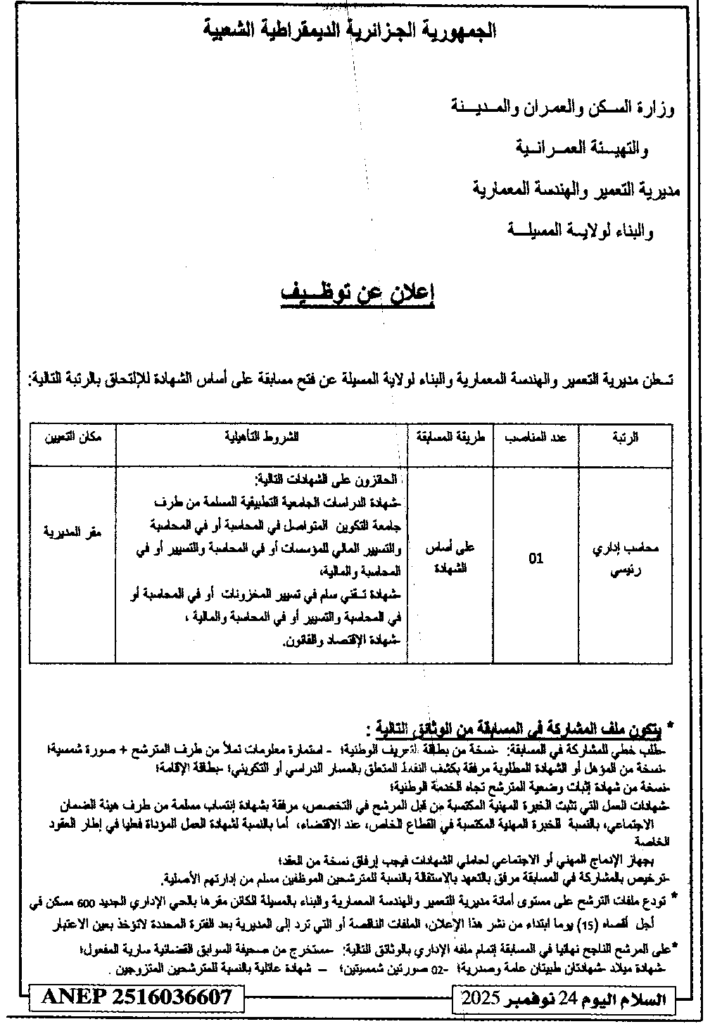 تعلن مديرية التعمير والهندسة المعمارية والبناء لولاية المسيلة عن فتح مسابقة على أساس الشهادة للإلتحاق بالرتبة التالية: