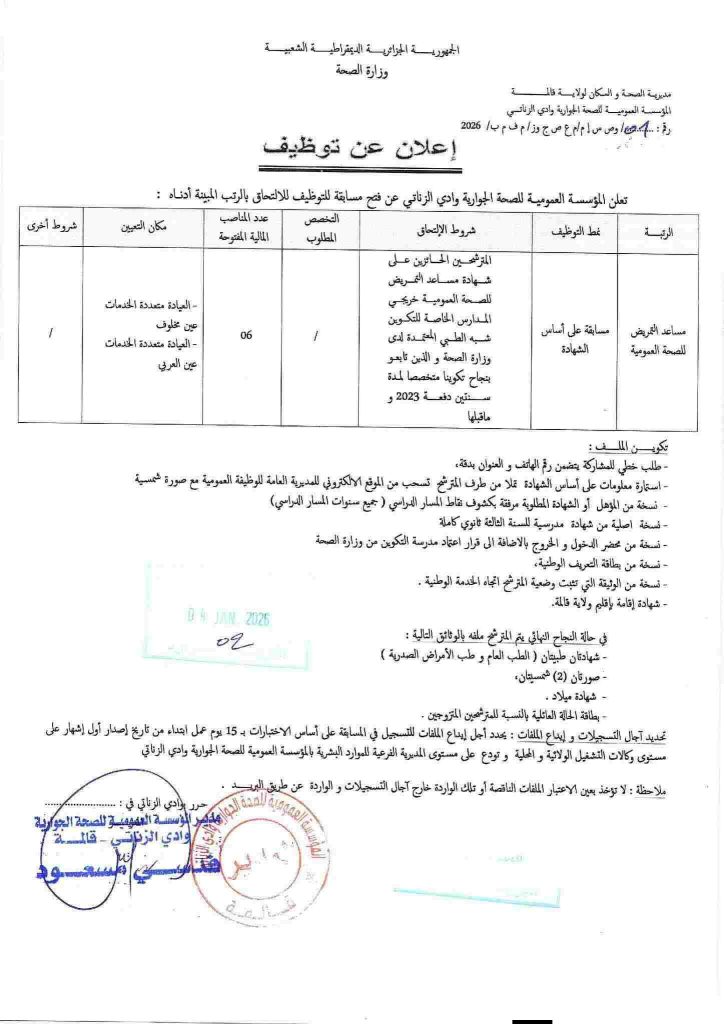تعلن المؤسسة العمومية للصحة الجوارية وادي الزناتي عن فتح مسابقة للتوظيف للالتحاق بالرتب المبينة أدناه: