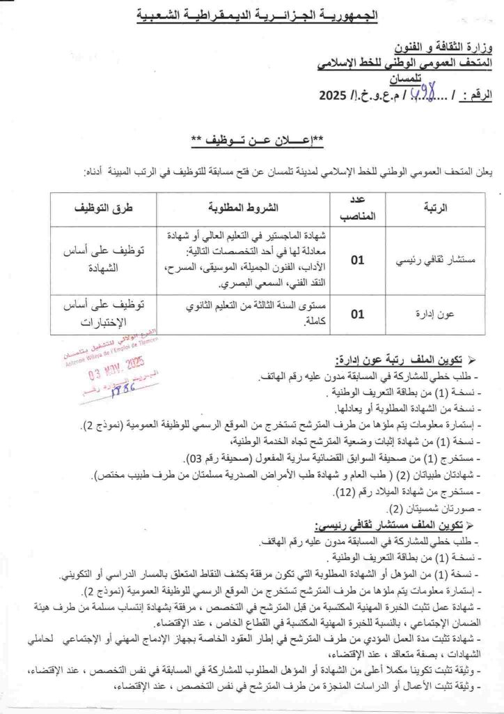 يعلن المتحف العمومي الوطني للخط الإسلامي لمدينة تلمسان عن فتح مسابقة للتوظيف في الرتب المبينة أدناه: