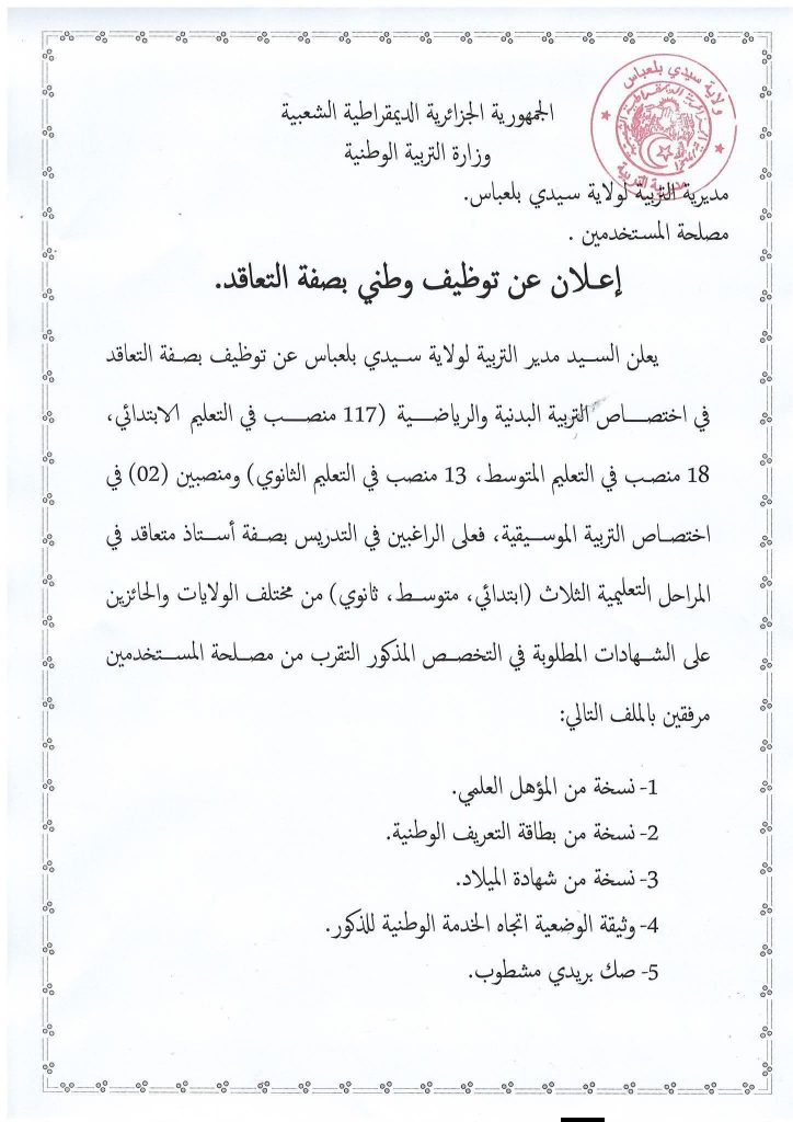 يعلن السيد مدير التربية لولاية سيدي بلعباس عن توظيف بصفة التعاقد في اختصاص التربية البدنية والرياضية (117 منصب في التعليم الابتدائي، 18 منصب في التعليم المتوسط، 13 منصب في التعليم الثانوي) ومنصبين (02) في اختصاص التربية الموسيقية، فعلى الراغبين في التدريس بصفة أستاذ متعاقد في المراحل التعليمية الثلاث (ابتدائي، متوسط، ثانوي) من مختلف الولايات والحائزين على الشهادات المطلوبة في التخصص المذكور التقرب من مصلحة المستخدمين مرفقين بالملف التالي: