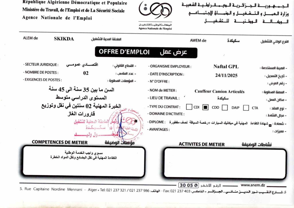 - الخبرة المهنية: (02) سنتين في نقل وتوزيع قوارور الغاز