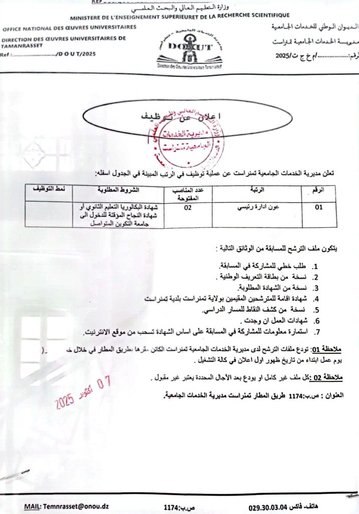 ملاحظة 01: تودع ملفات الترشح لدى مديرية الخدمات الجامعية تمنراست الكائن مقرها بالطريق المطار في خلال خمسة (05) يوم عمل ابتداء من تاريخ ظهور أول إعلان في كافة التشغيل.