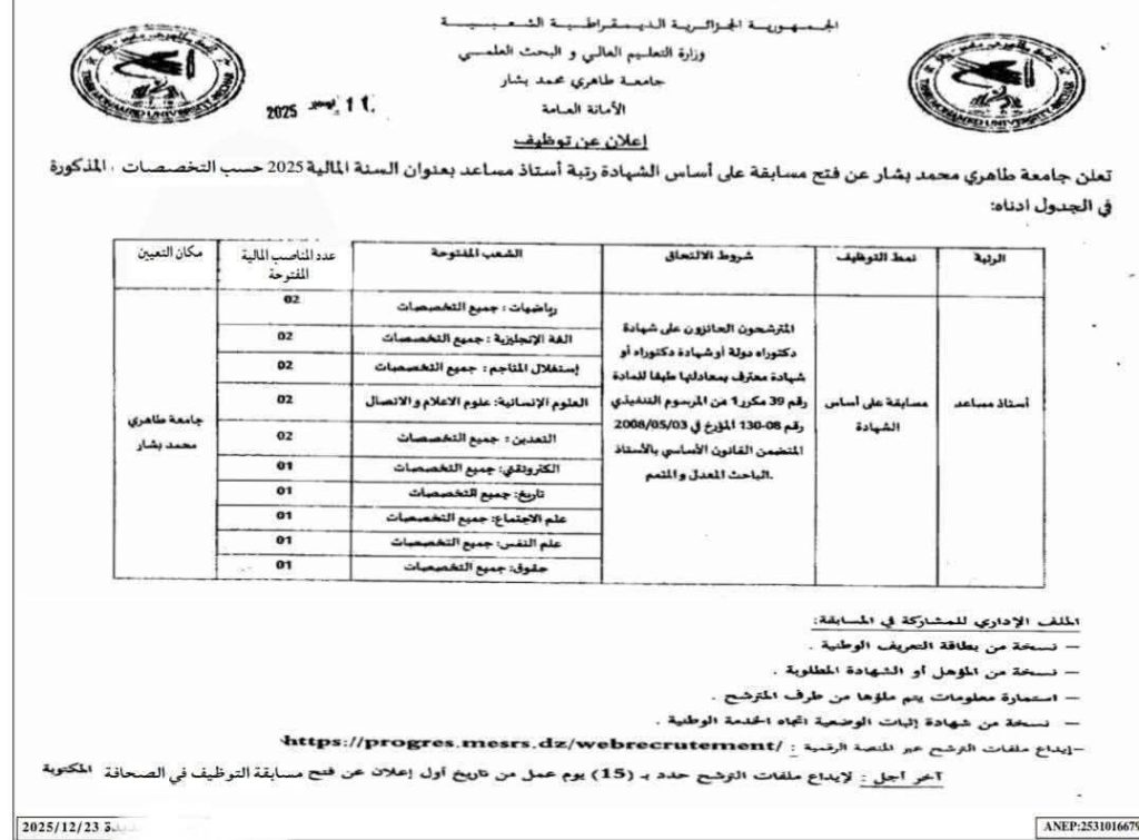 تعلن جامعة طاهري محمد بشار عن فتح مسابقة على أساس الشهادة لرتبة أستاذ مساعد بعنوان السنة المالية 2025 حسب التخصصات المذكورة في الجدول أدناه: