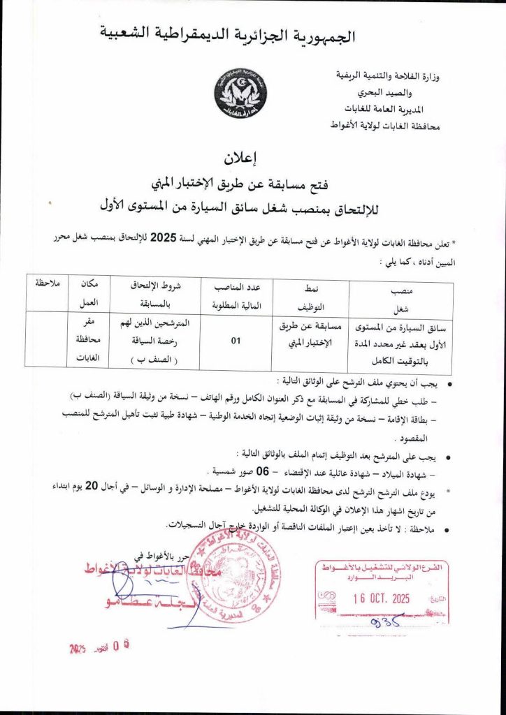 تعلن محافظة الغابات لولاية الأغواط عن فتح مسابقة عن طريق الإختبار المهني لسنة 2025 للإلتحاق بمنصب شغل محرر أمين أدناه ، كما يلي: