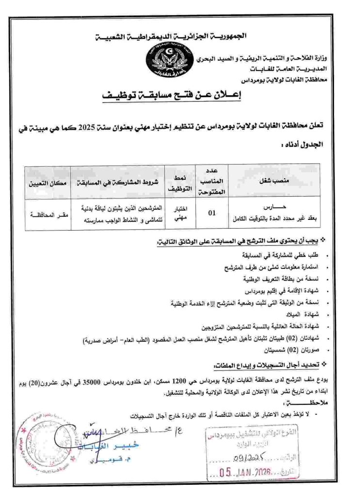 تعلن محافظة الغابات لولاية بومرداس عن تنظيم إختبار مهني بعنوان سنة 2025 كما هي مبينة في الجدول أدناه :