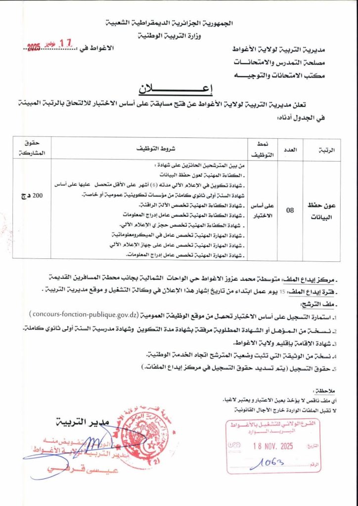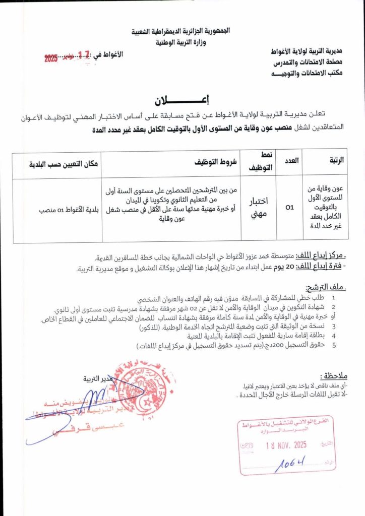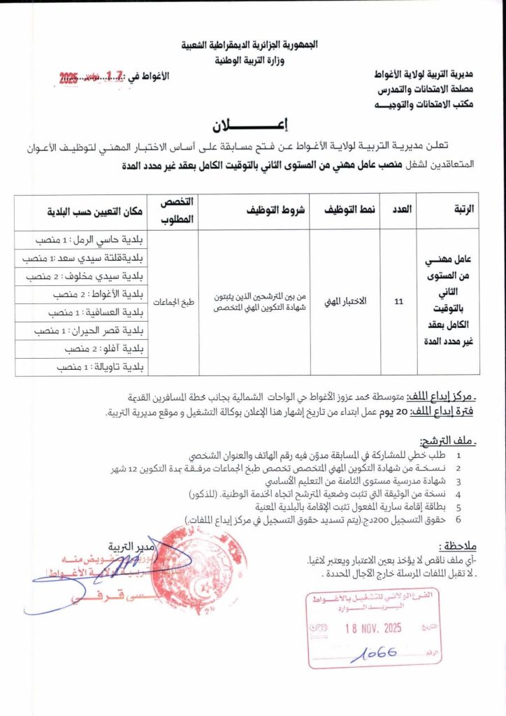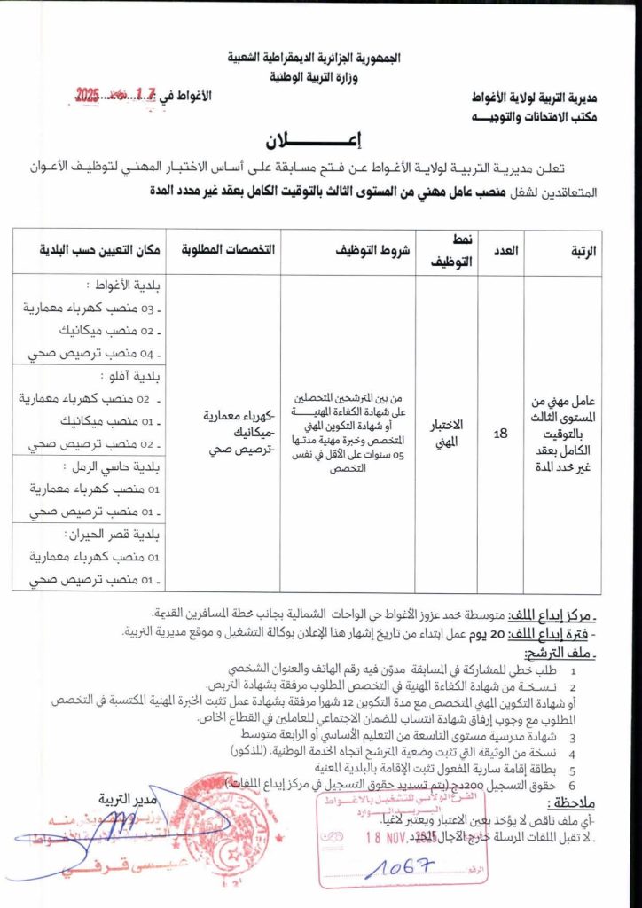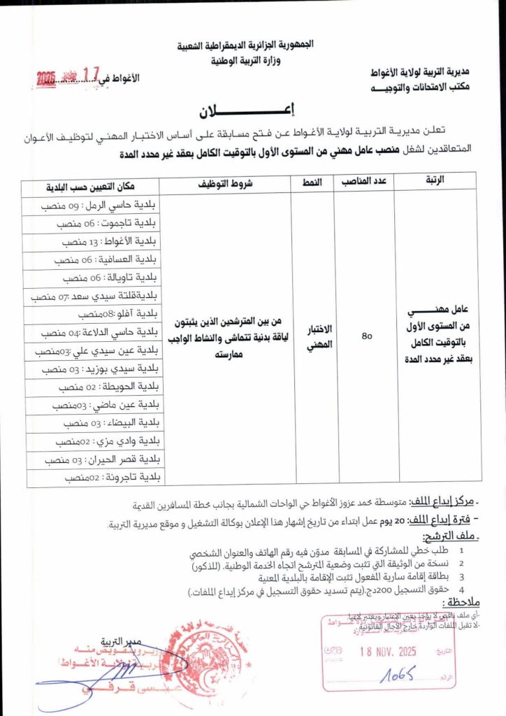 تعلن مديرية التربية لولاية الأغواط عن فتح مسابقة على أساس الاختبار المهني لتوظيف الأعوان المتعاقدين لشغل منصب عامل مهني من المستوى الثالث بالتوقيت الكامل بعقد غير محدد المدة.