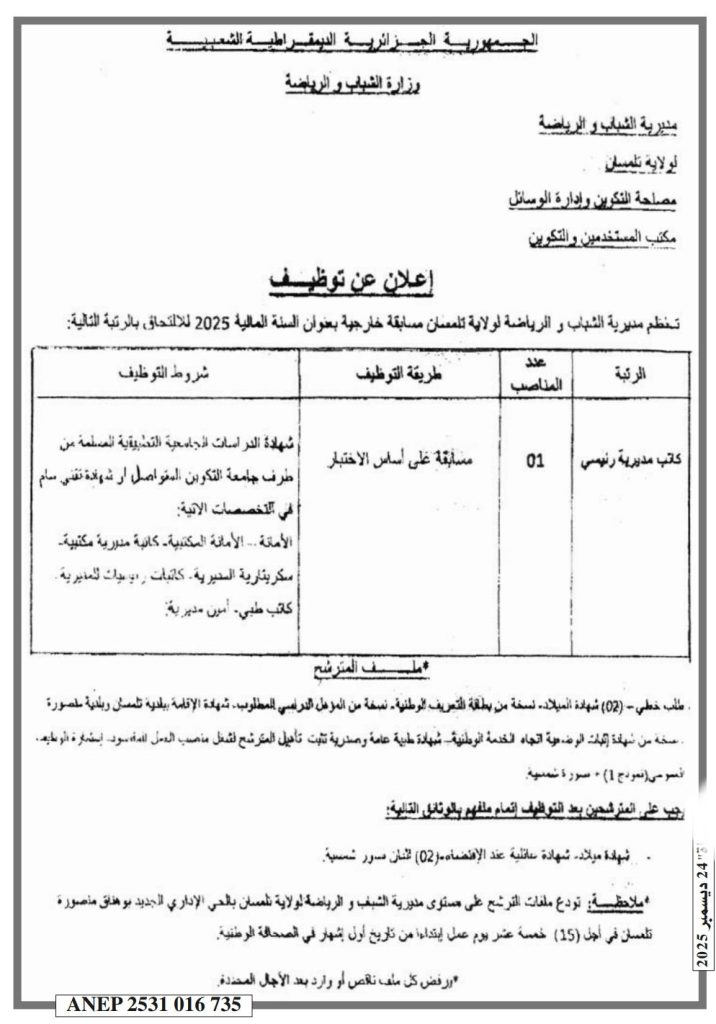 تنظم مديرية الشباب والرياضة لولاية تلمسان مسابقة خارجية بعنوان السنة المالية 2025 للالتحاق بالرتبة التالية: