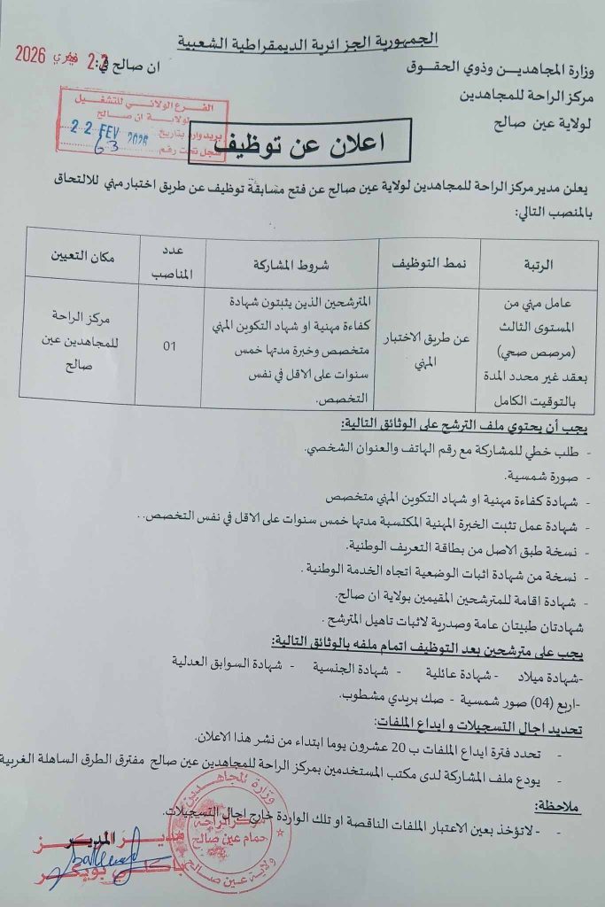 يعلن مدير مركز الراحة للمجاهدين لولاية عين صالح عن فتح مسابقة توظيف عن طريق اختبار مهني للالتحاق بالمنصب التالي: