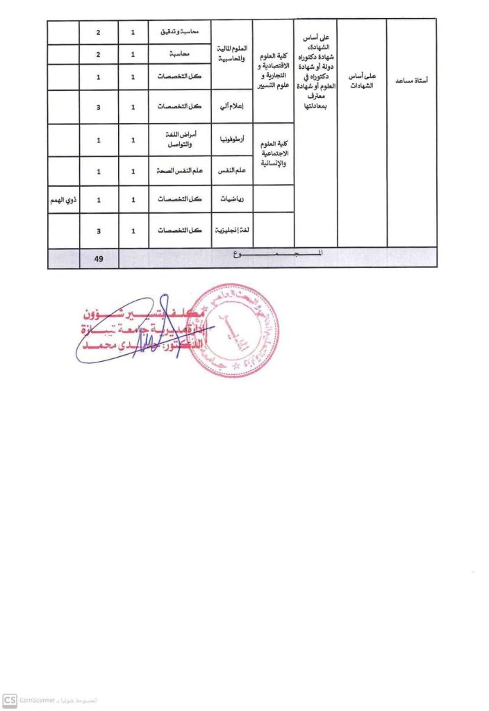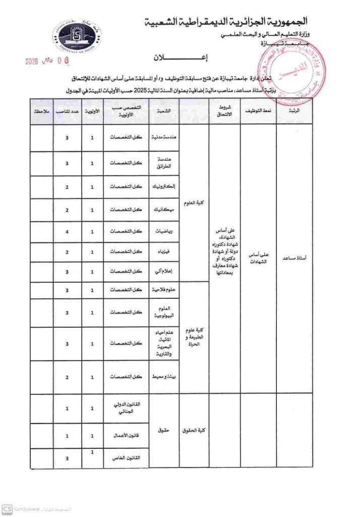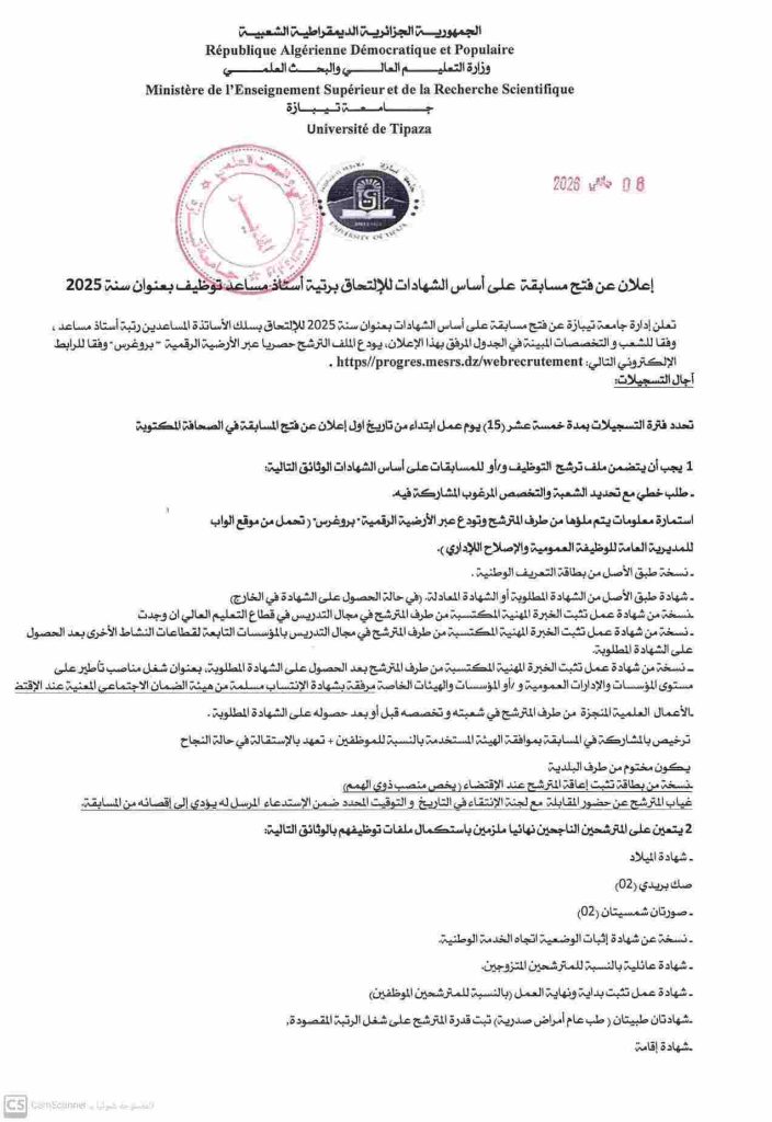 تعلن إدارة جامعة تيبازة عن فتح مسابقة على أساس الشهادات بعنوان سنة 2025 للالتحاق بسلك الأساتذة المساعدين رتبة أستاذ مساعد “ب”، وفقا للشعب والتخصصات المبينة في الجدول المرفق بهذا الإعلان، يودع الملف حصريا عبر الأرضية الرقمية “بروغرس” وفقا للرابط الإلكتروني التالي: https://progres.mesrs.dz/webrecrutement .