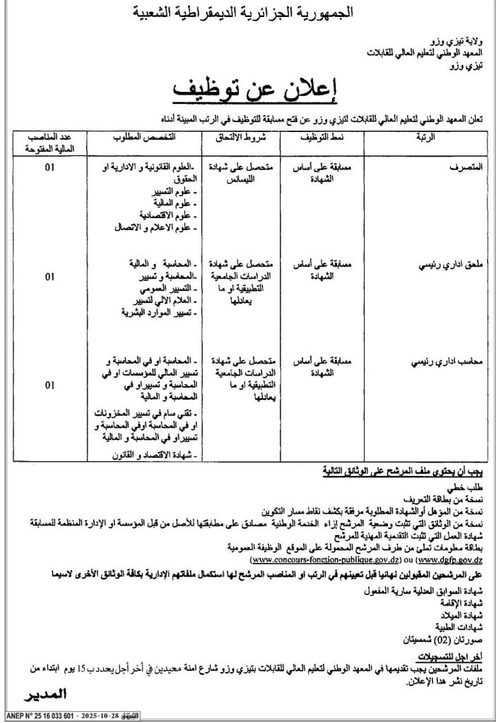 يعلن المعهد الوطني للتعليم العالي للقابلات تيزي وزو عن فتح مسابقة للتوظيف في الرتب المبينة أدناه