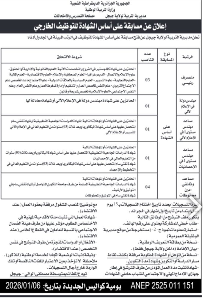 تعلن مديرية التربية لولاية جيجل عن فتح مسابقة على أساس الشهادة للتوظيف في الرتب المبينة في الجدول أدناه: